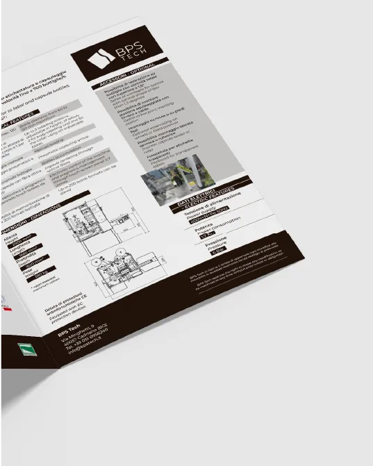 Per BPSTech abbiamo avviato il progetto partendo dalla definizione dell’identità visiva, con la realizzazione del logo aziendale. Il pittogramma che accompagna il naming rappresenta la sintesi tra l’etichetta e il profilo della bottiglia di vino, settore in cui l’azienda opera con soluzioni tecnologiche avanzate.